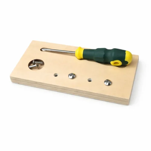The set includes a wooden base, four screws that fit into the designated holes, and a screwdriver with a lightweight, comfortable grip. By turning the screws, children can practice fine motor skills, grasping ability, and hand-eye coordination—essential skills for daily life and future learning. The activity supports concentration and manual dexterity, providing children with a calm and hands-on play experience.