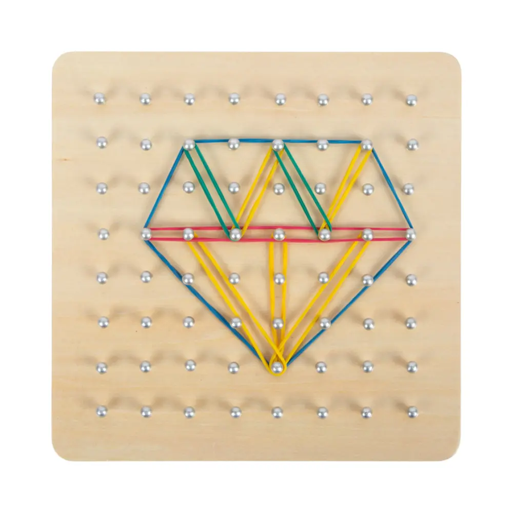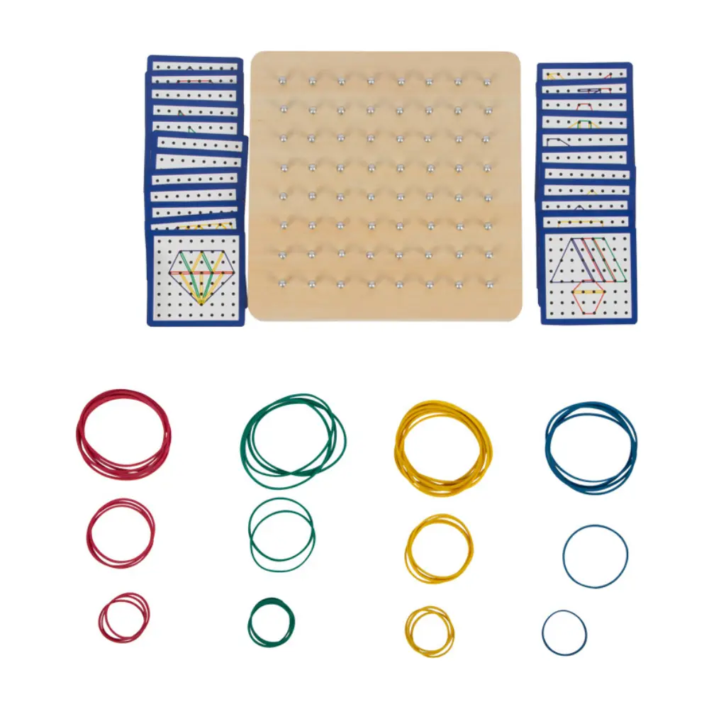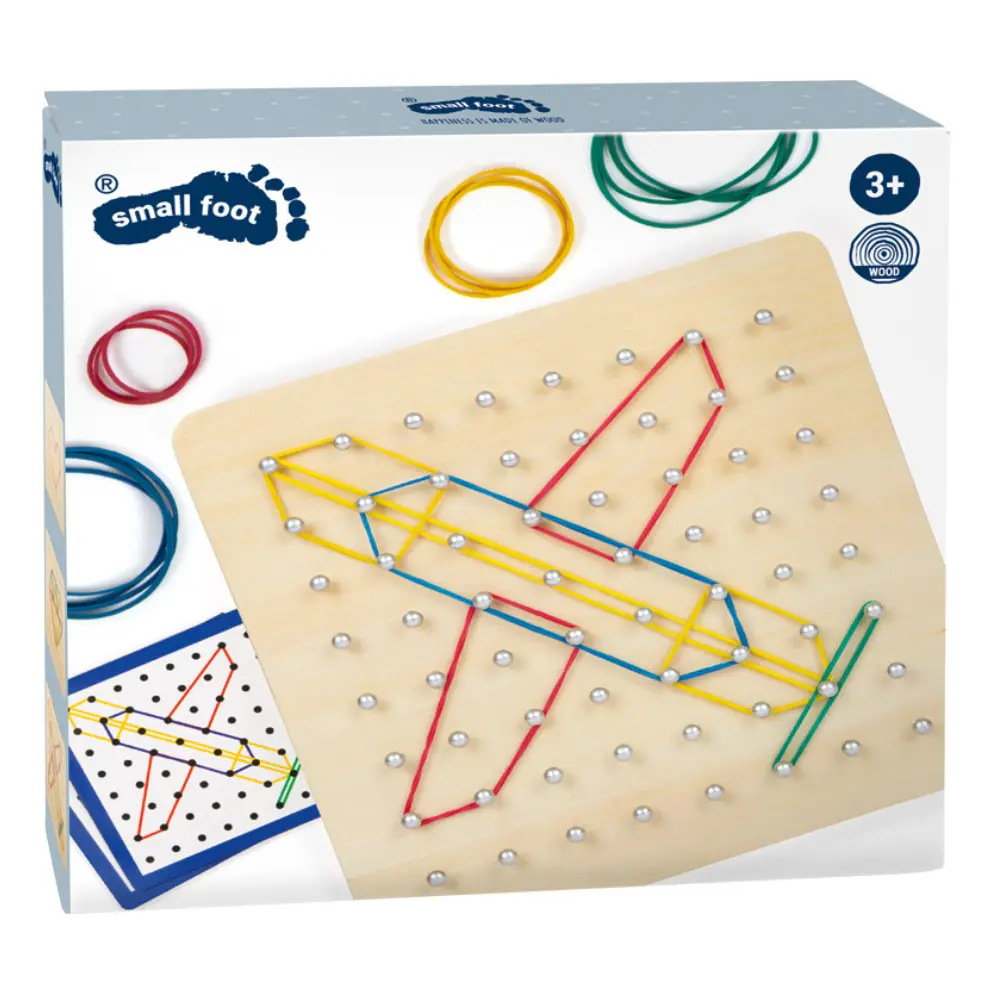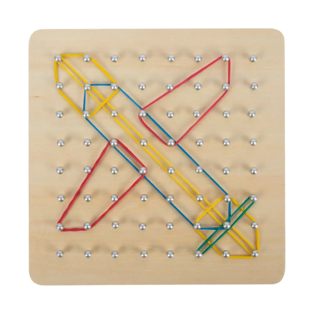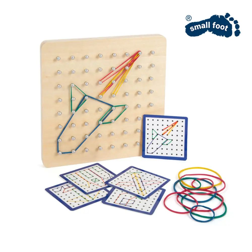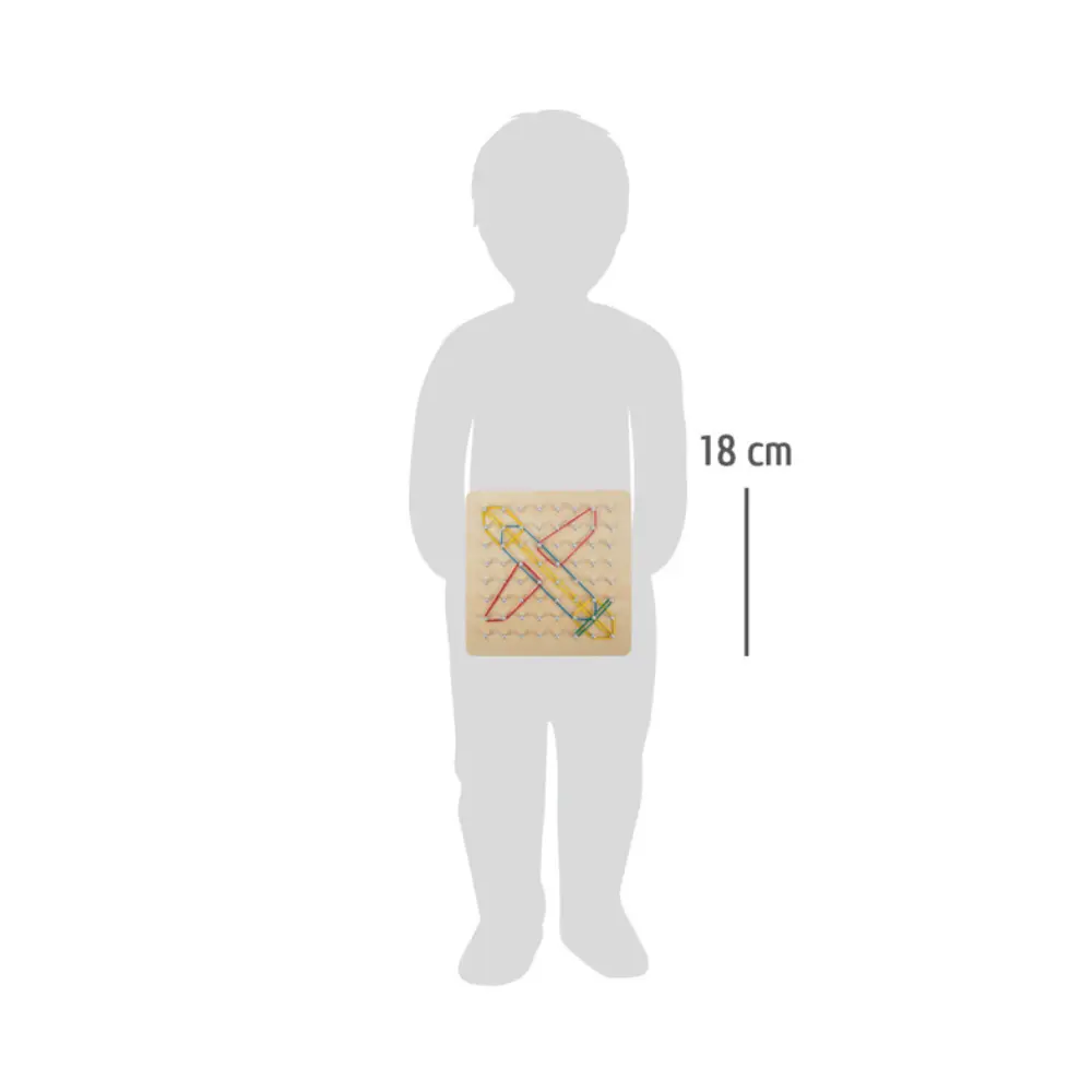 Geoboard is a versatile tool designed to develop children's creativity and spatial awareness. It has a sturdy wooden base and metal spikes that allow children to use coloured rubbers to create different geometric shapes and patterns. Ideal for developing fine motor skills, hand-eye coordination and imagination. This hands-on learning toy has endless possibilities for discovery and creative play!