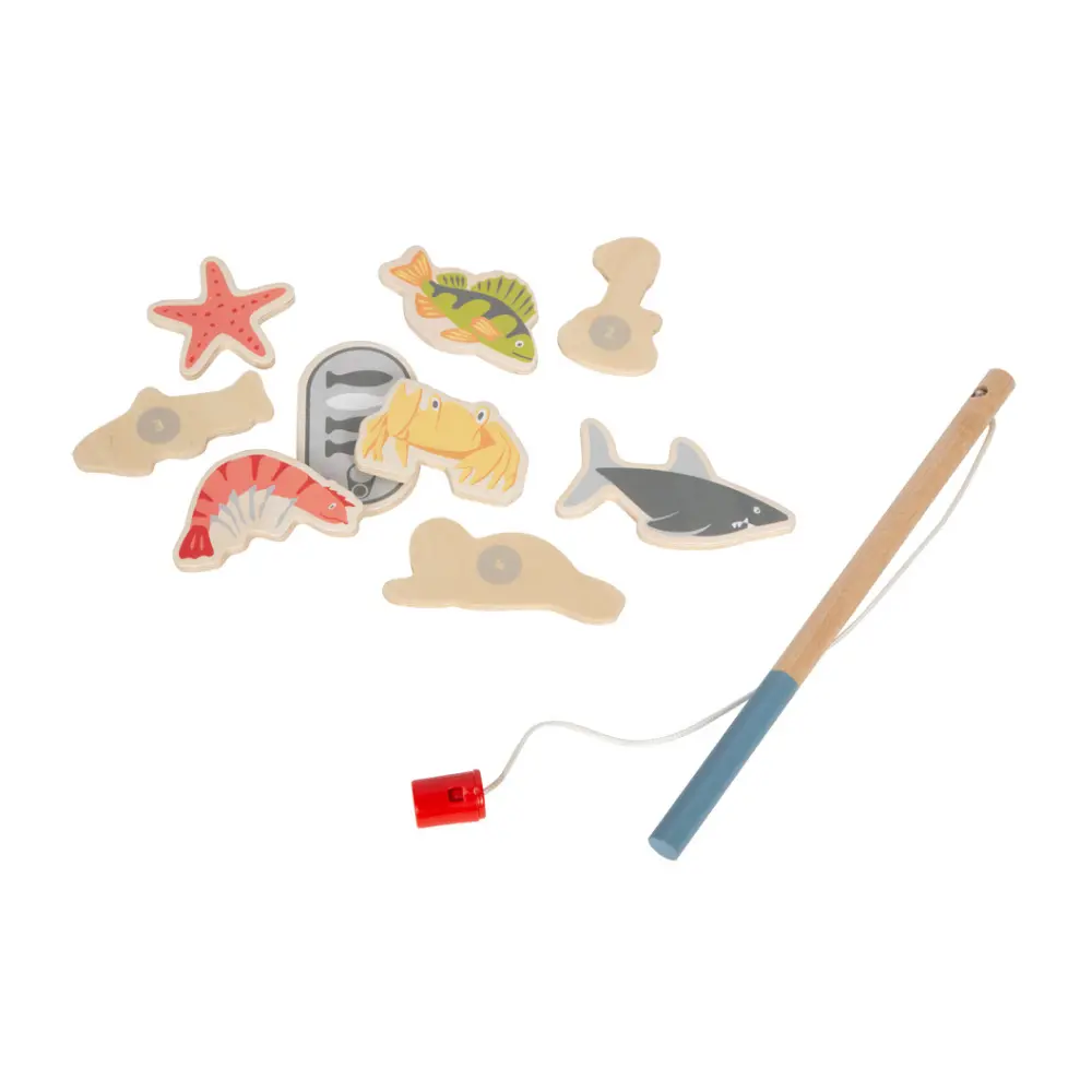 Go fishing with some wild friends! With this classic wooden children's game, you'll need skill and patience in order to fish the correct sea creatures out of their sea with the wooden fishing rod. The rooster keeps an eye out for the next fish to catch while the cow fishes. Spinning the boat on the compass indicates which sea creature should be caught next. And this is practical: The bottom flap of the high-quality game box goes together with additional walls to make a three-dimensional game field. Playable in two variations.