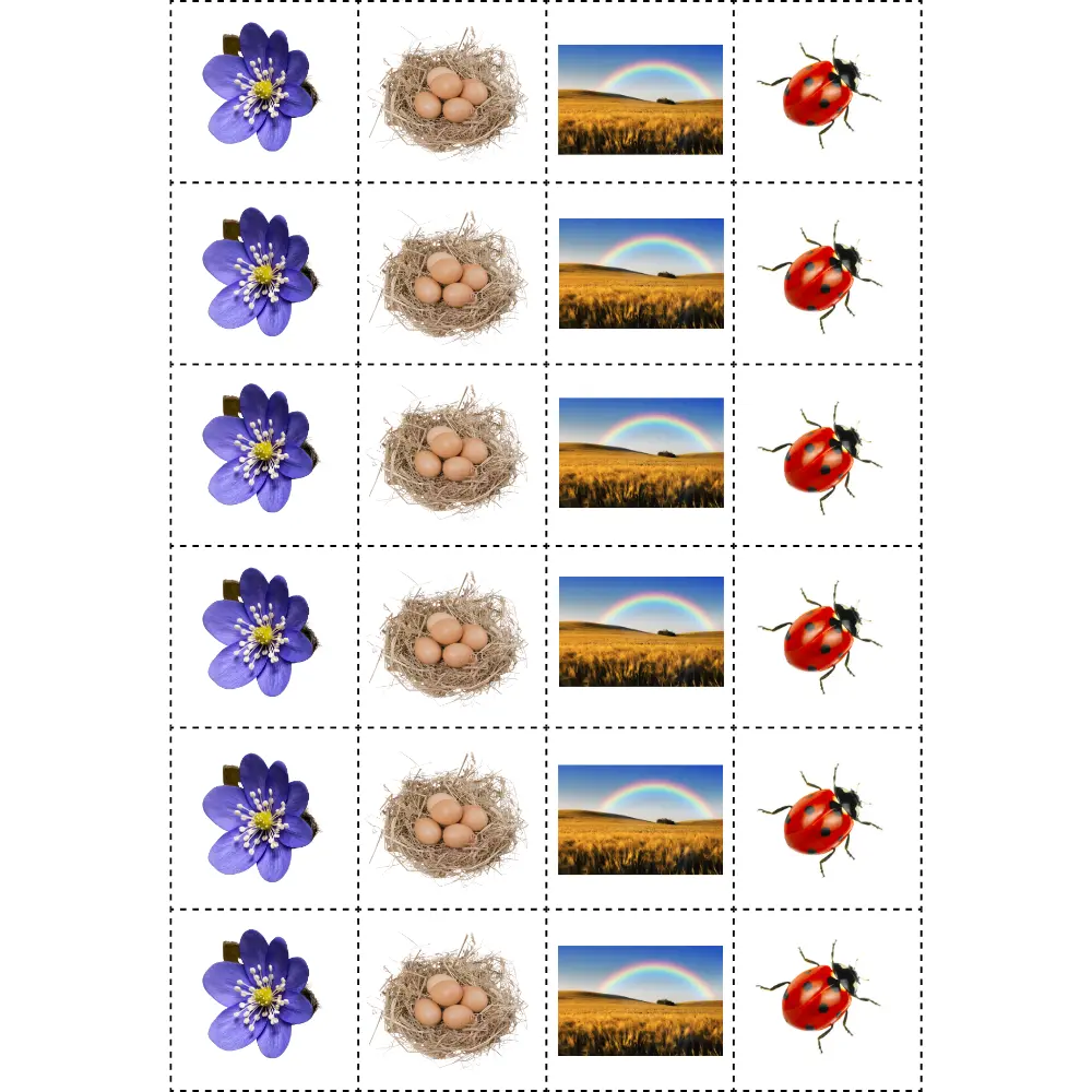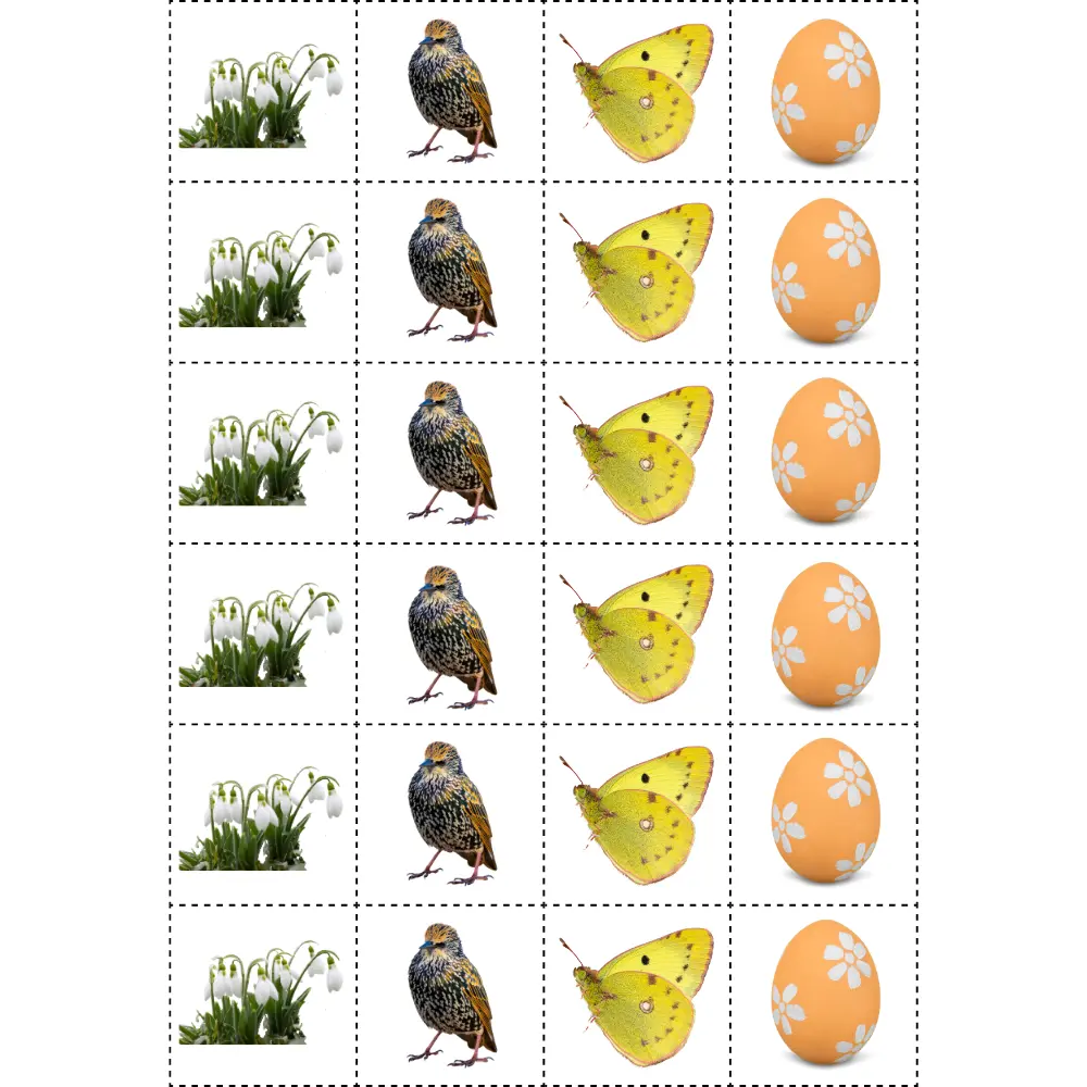 Children cut out various signs of spring along the dotted lines, which can be used in crafts - cards, pictures, collages, etc.