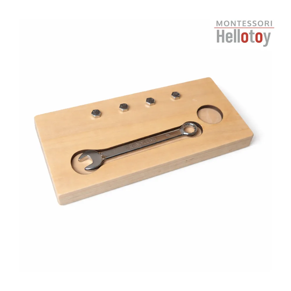 This activity can be presented to the child as a goal-oriented task: first, the child is shown how to hold a wrench and the motion of turning a screw, and then encouraged to try tightening and loosening the nut on their own. This repetitive turning motion trains hand-eye coordination, finger strength, and control—skills that are essential for later writing, buttoning, and other activities requiring fine motor skills.