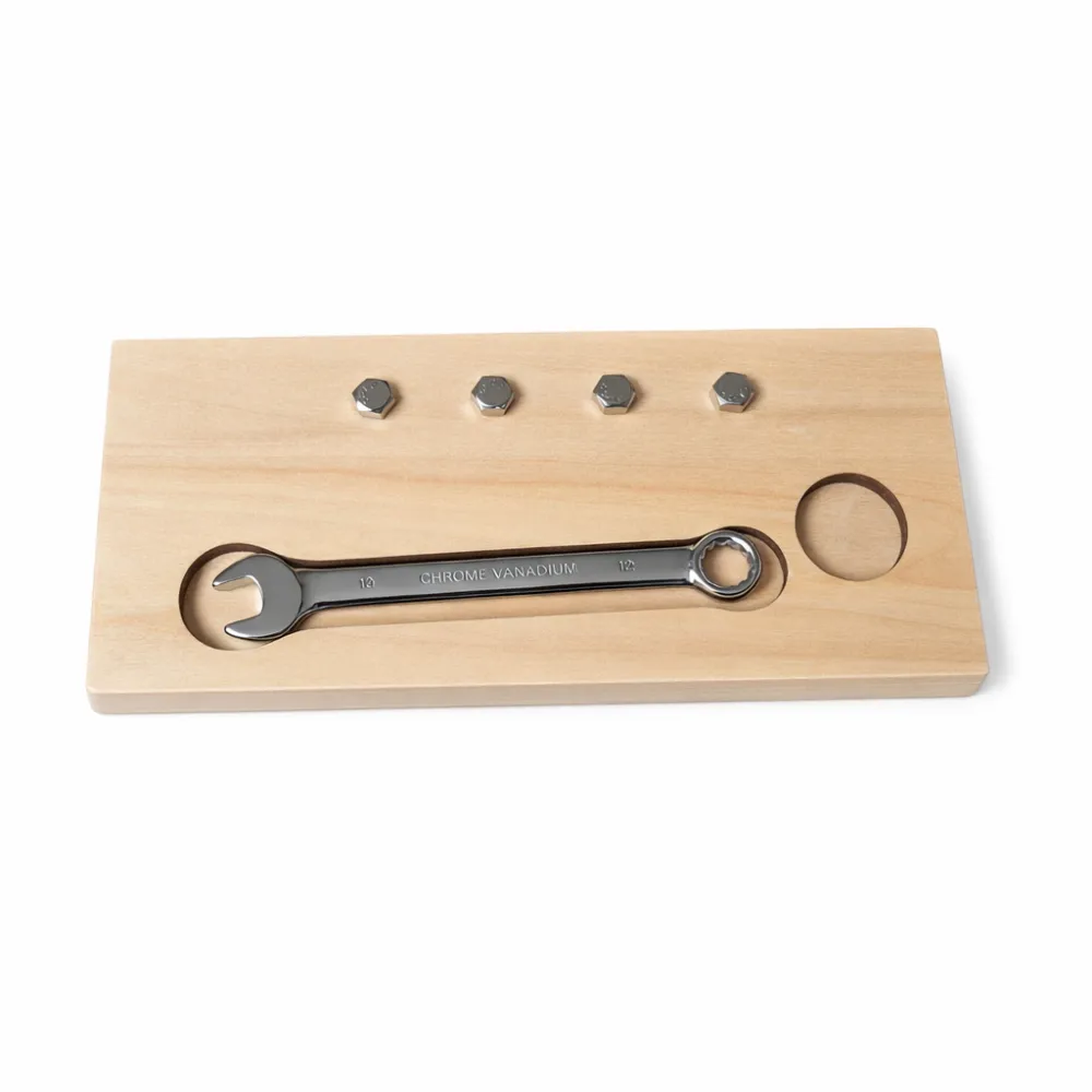 Working with a wrench is a calm, realistic and practical activity that helps a child learn tool knowledge, patience and concentration. It also supports a child's independence because the activity is logical, repetitive and gives the child clear feedback: if the nut fits, it is tightened; if not, it is necessary to try again.