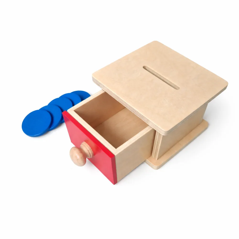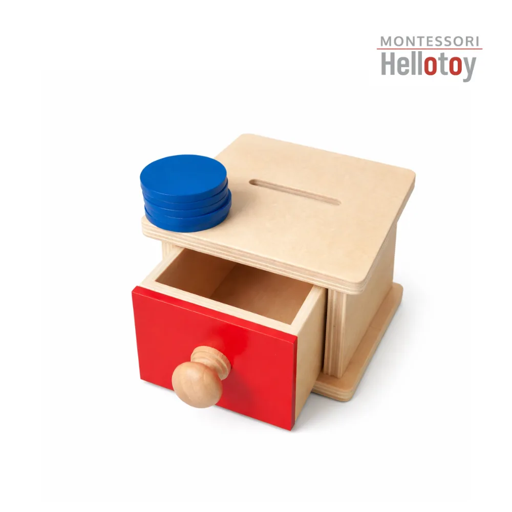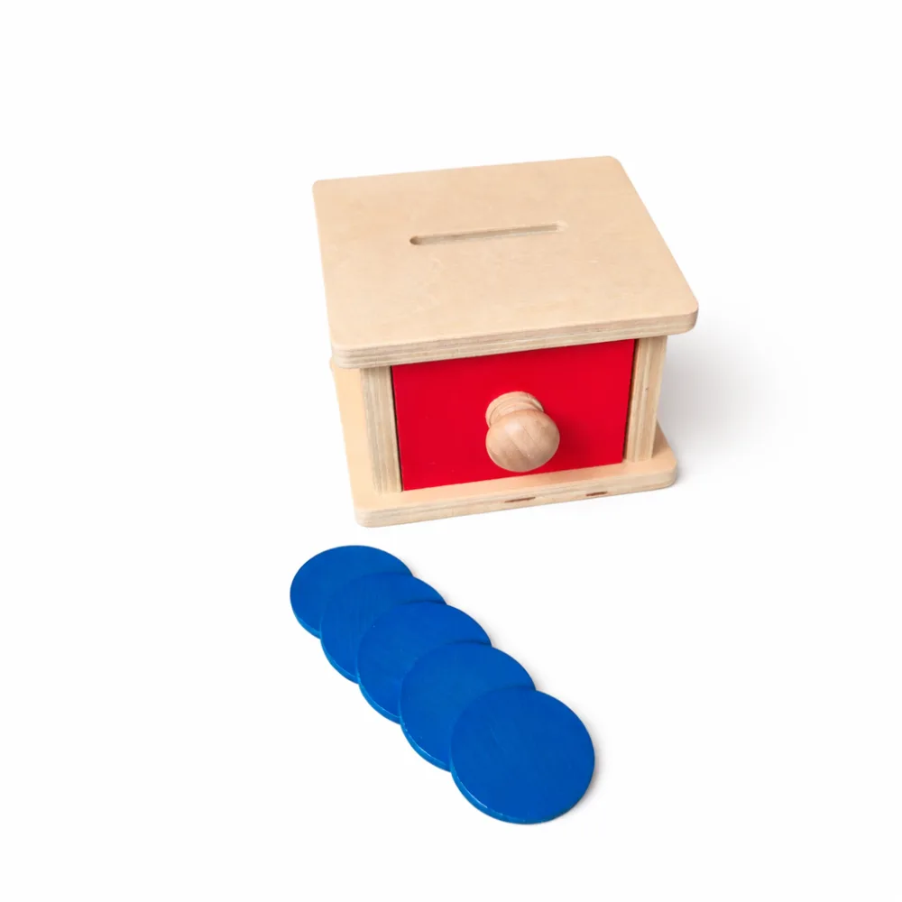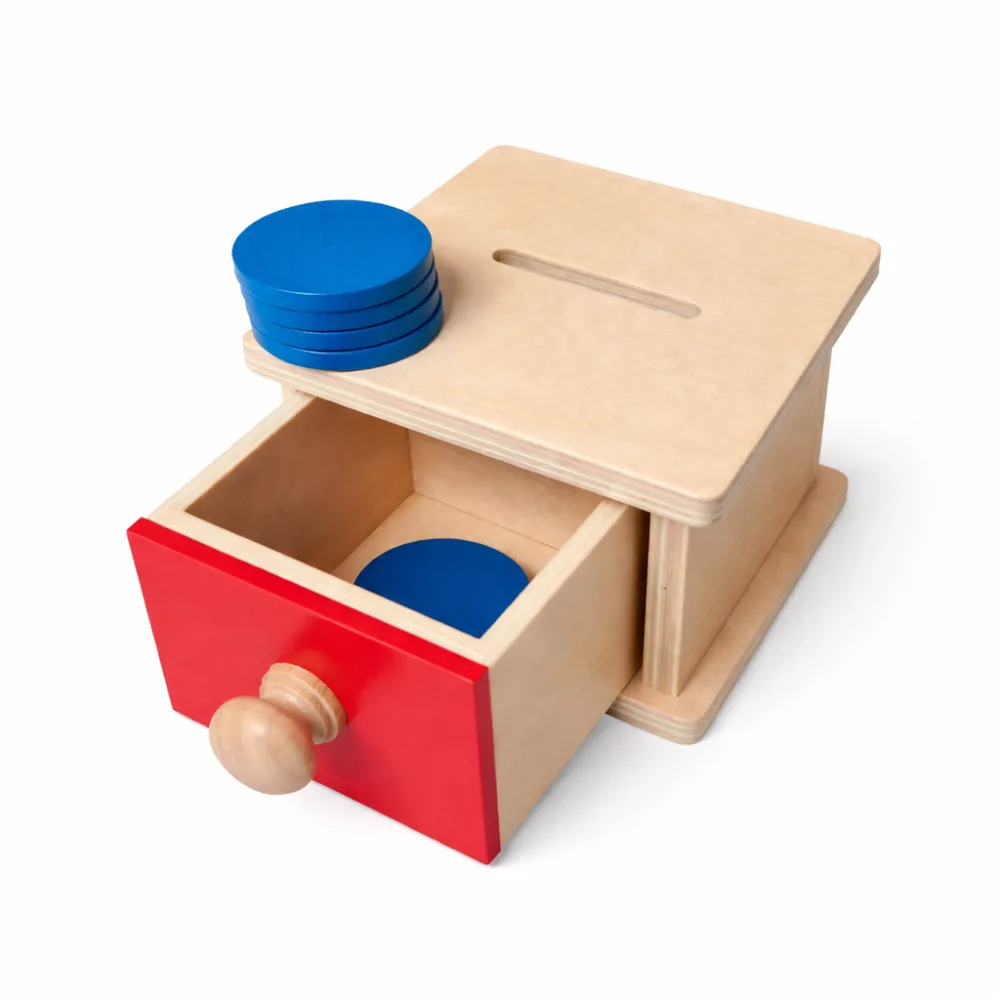 Coin box is a Montessori tool that helps young children develop both motor and cognitive skills through a simple and repetitive activity. During the game, the child places wooden coins in the mailbox opening and can then open the box to retrieve the coins. This activity offers the child the joy of discovery and helps them understand cause-and-effect relationships and the permanence of objects – the knowledge that an object exists even when it is momentarily out of sight.