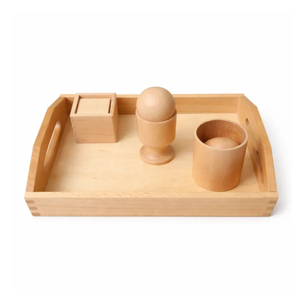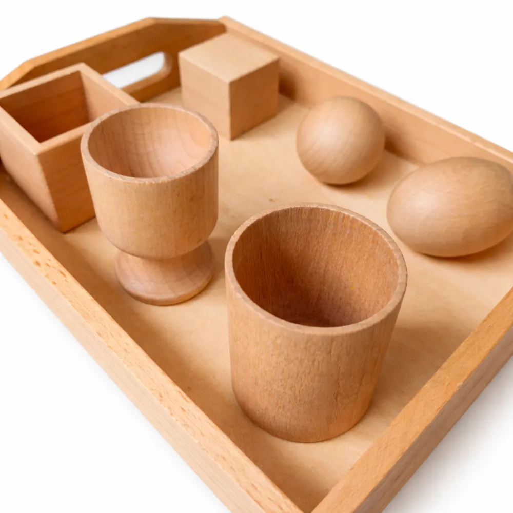 See on puidust arendav vahend, kus komplektis on 3D-geomeetrilised kujundid ja vastavad hoidikud kandikul, kuhu need tuleb sobitada ja asetada.