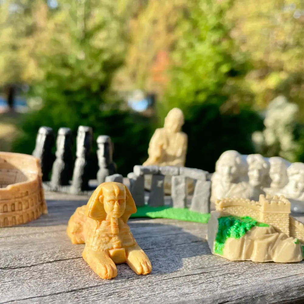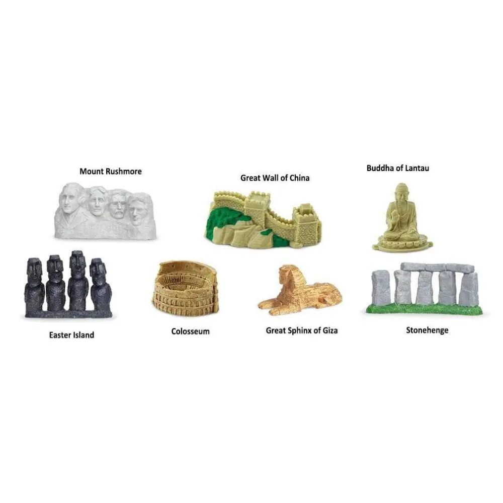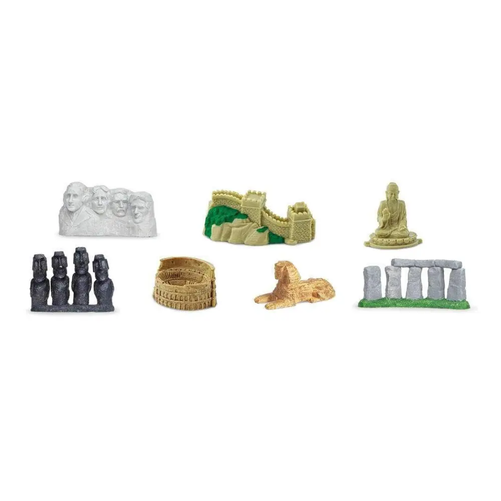 Reisige ümber maailma oma kodu diivanil! See minfiguuride komplekt sisaldab 7 ajaloolist vaatamisväärsust, sealhulgas Mount Rushmore’i, Suurt Hiina müüri, Tian Tan Buddha, Moaid, Colosseumi, Chephreni sfinksi ja Stonehenge’i.