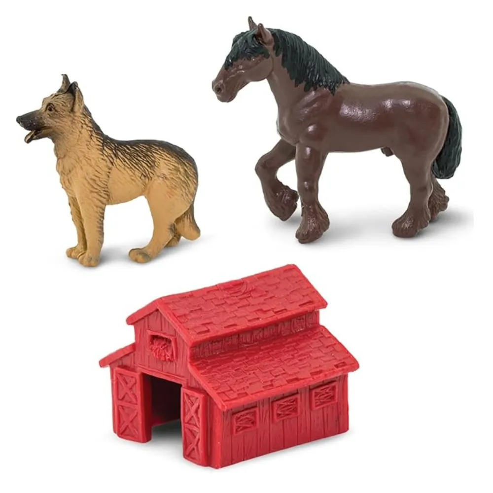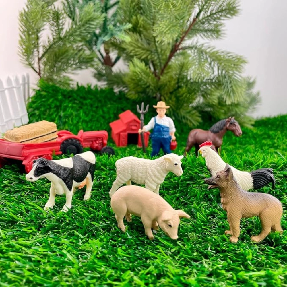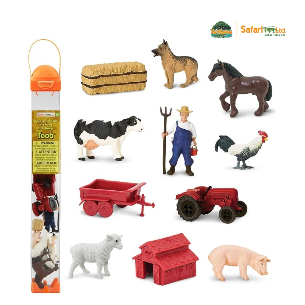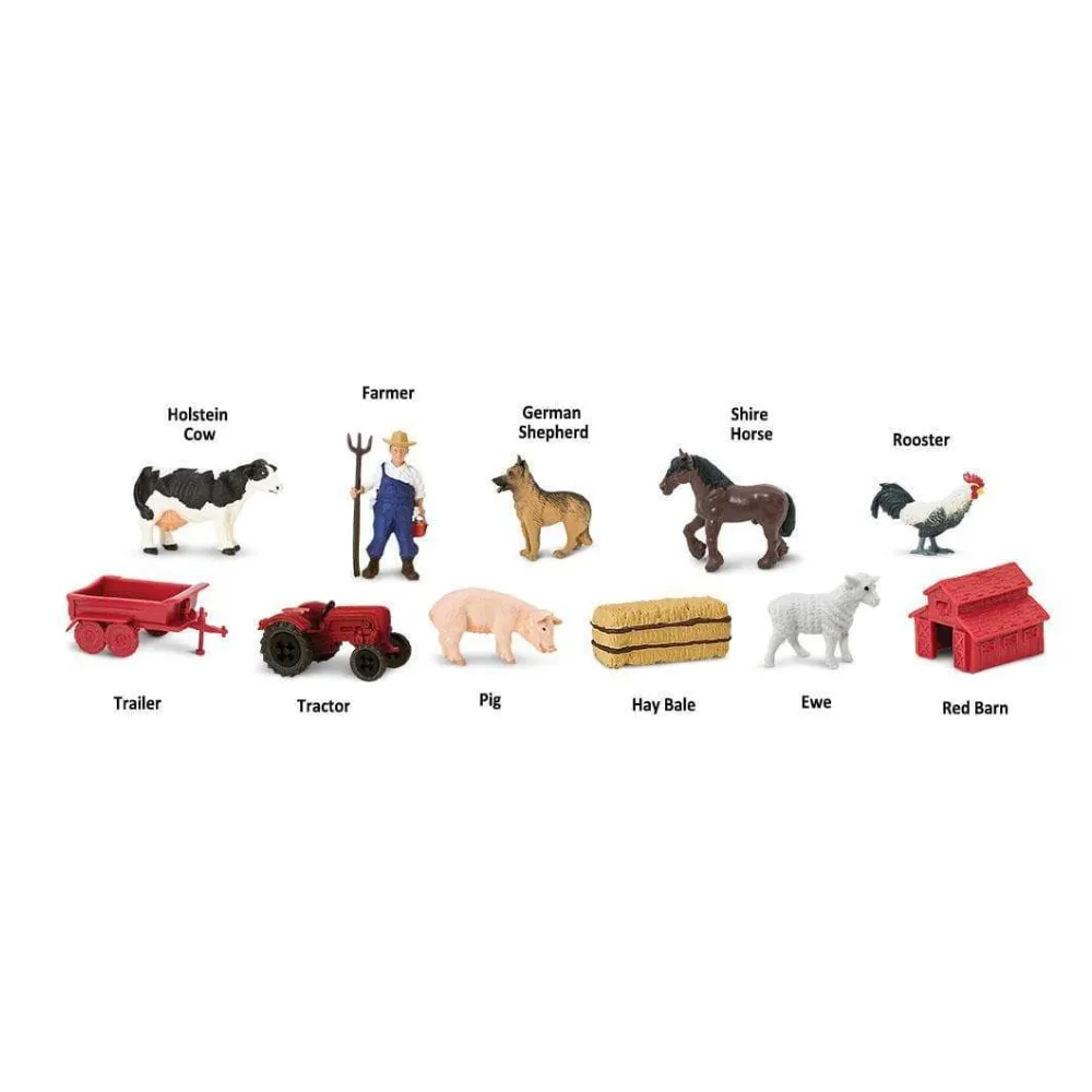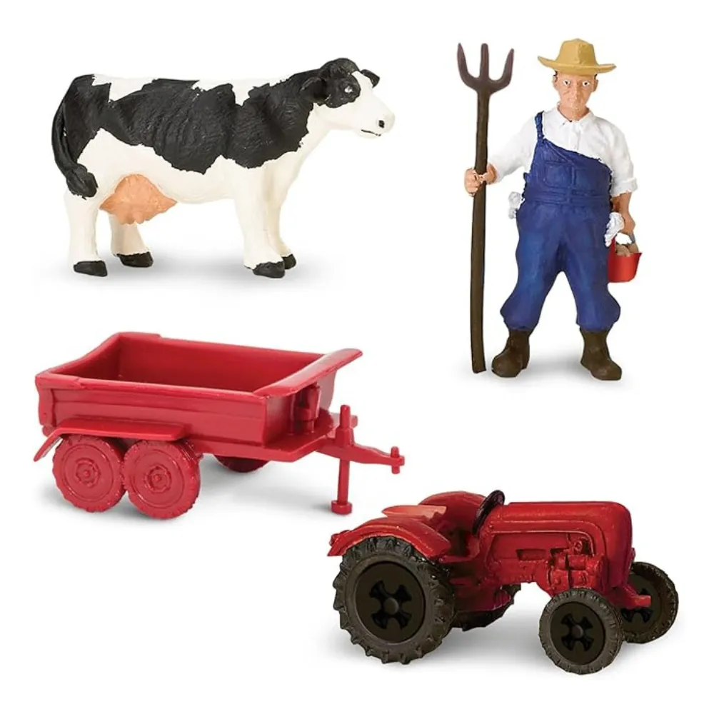 Talu pidamine võib olla raske töö, aga see on väga oluline! Sellel komplektil on kõik vajalik, et muuta teie mängutuba maapiirkonna taluks, sealhulgas lehm, hobune, Saksa lambakoer, lammas, siga, kana, traktor käruga, laut, heinapall ja talupidaja.