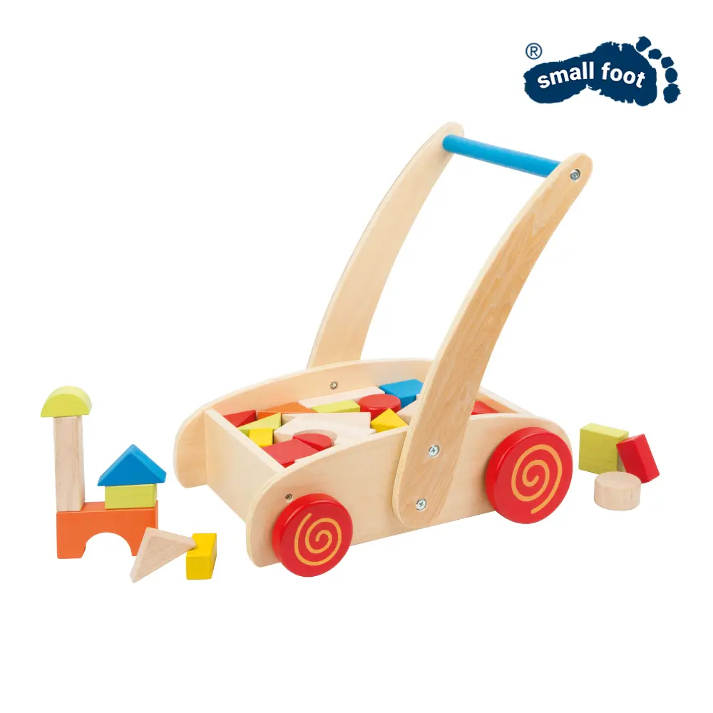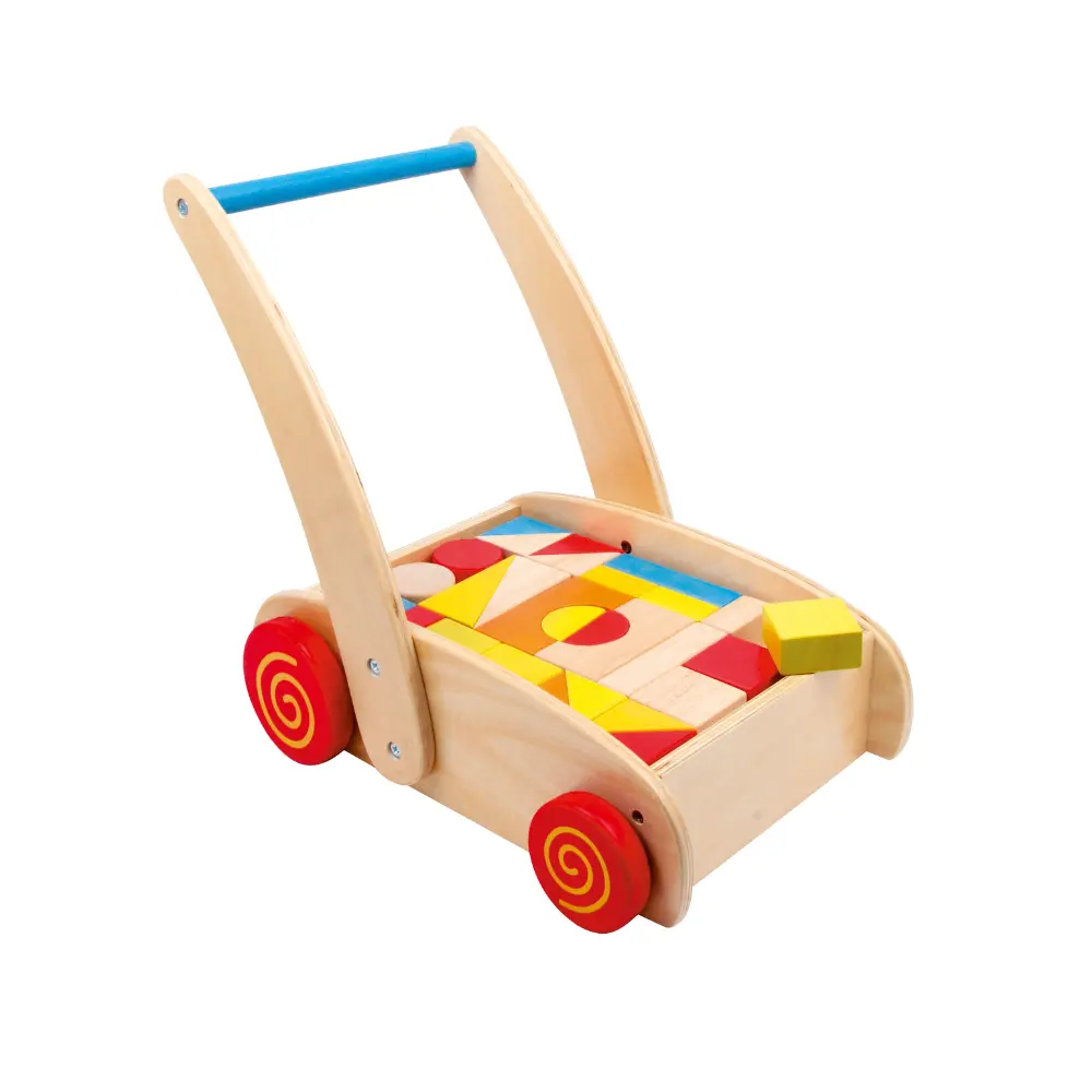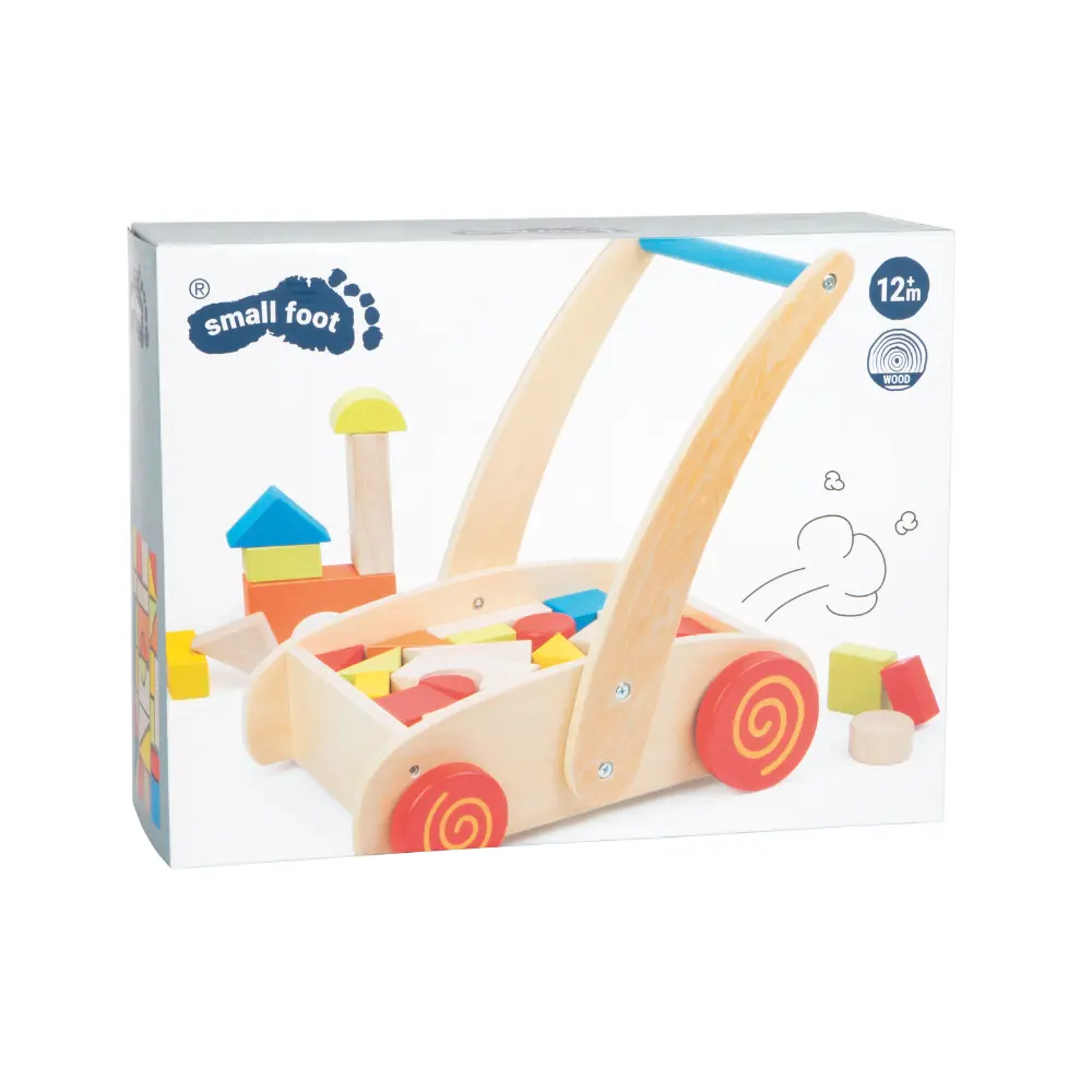 See stabiilne jalutuskäru on valmistatud täispuidust ja vineerist! Erineva kujuga pöögipuust klotsid (5–10 cm) arendavad motoorseid oskusi ning ka värvide ja kujundite äratundmist. Mõõtmed: 37 x 28,5 x 39 cm