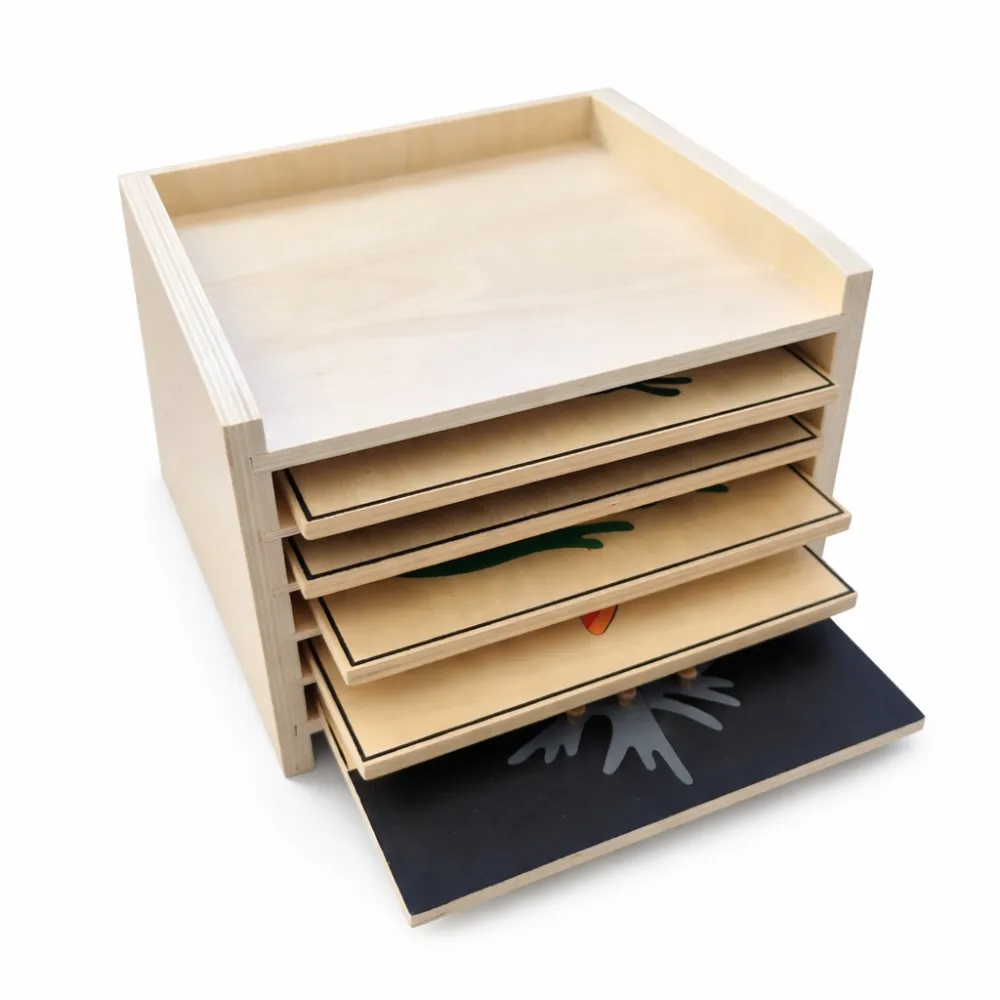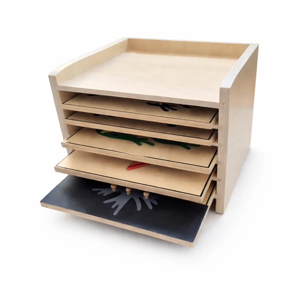 See puidust viie pusle kapp on praktiline viis hoiustada viit montessori nupupuslet. Iga pusle oma sahtlis loob lapsele struktureeritud keskkonna, kus materjalid on selgelt nähtaval ja igal asjal on oma kindel koht.
